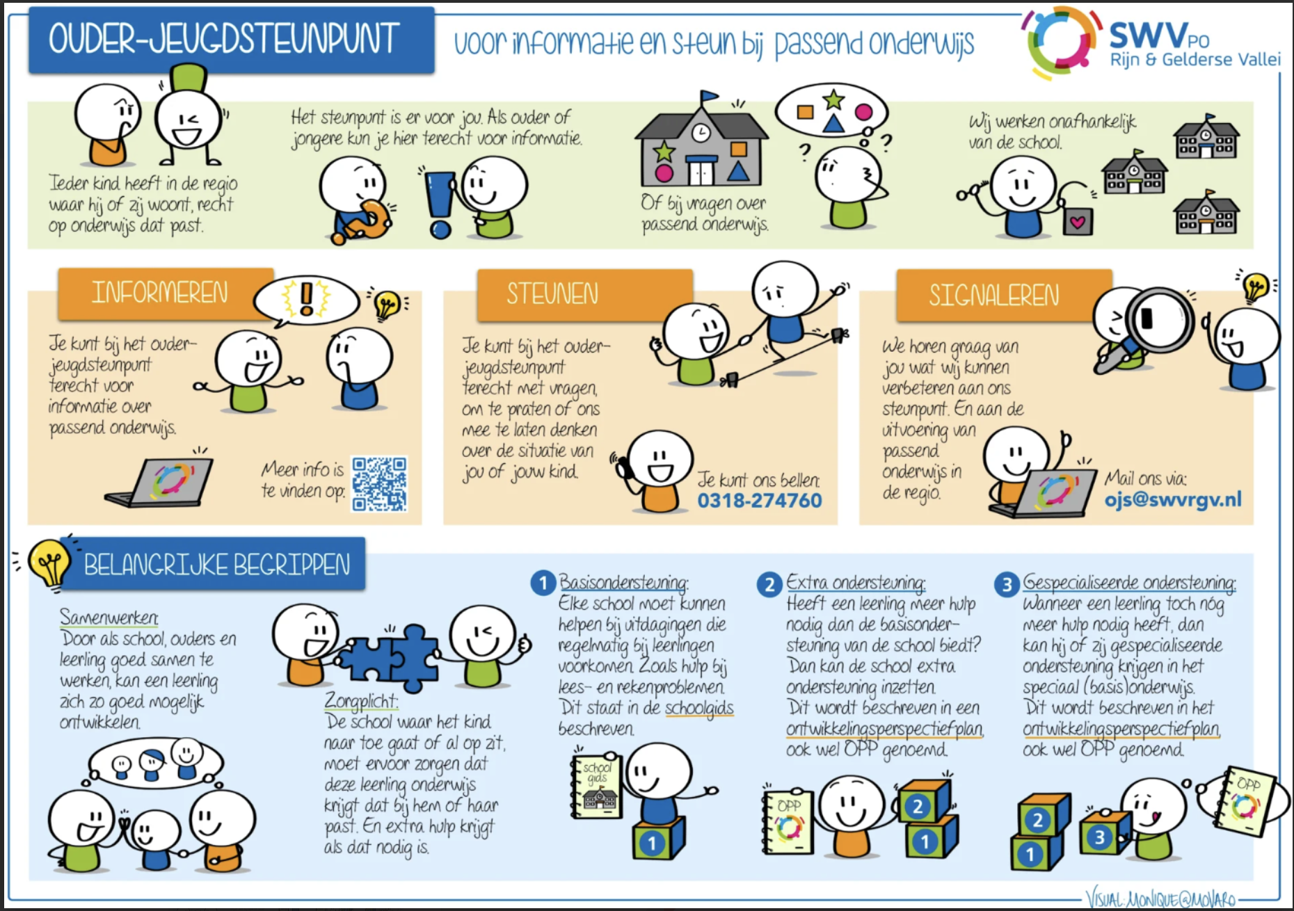Ouder-jeugd Steunpunt Samenwerkingsverband: Heb je vragen over de ondersteuning die je kind nodig heeft op school? Of wil je met iemand praten die met je meedenkt? Je kunt altijd terecht op je eigen basisschool, maar ook bij het ouder- en jeugdsteunpunt.